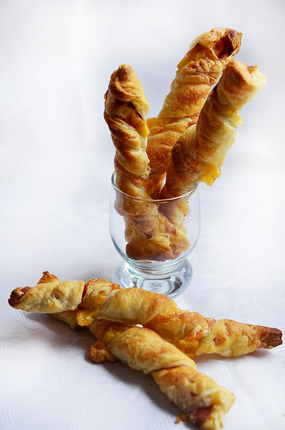 Ciasto francuskie kroimy na około 2 centymetrowe paski. Jeżeli ktoś woli grubsze paluchy może ukroić większy pasek. Jeżeli ktoś woli cieńsze to analogicznie kroimy cieńsze paski. Na to kładziemy plasterek szynki (przycinając odpowiednio po bokach, by miała taką samą szerokość jak pasek ciasta). Można położyć też 2 plasterki jeżeli wolimy więcej szynki. Na to kładziemy plaser sera żółtego, również przycięty odpowiednio do szerokości paska ciasta. Każdy pasek ciasta z szynką i serem, skręcamy.