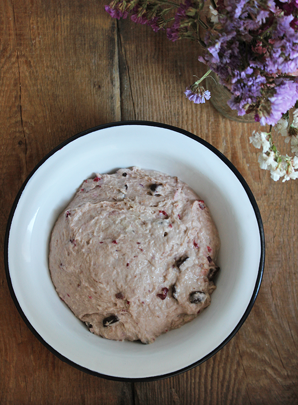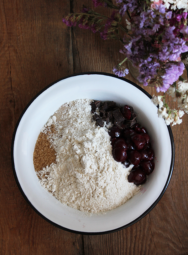 - Mąkę wsypujemy do misy, dodajemy drożdże, wydrylowane wiśnie, drobno pokrojone kawałki czekolady, cukier, sól. Wlewamy letnią wodę, wyrabiamy ciasto 5 minut, zostawiamy pod przykryciem na godzinę.
