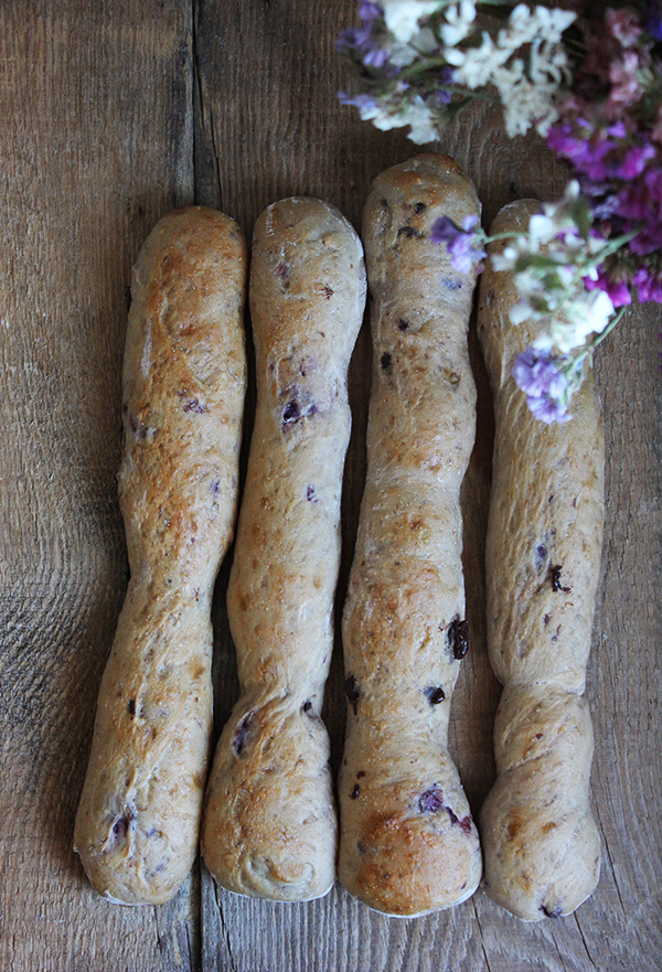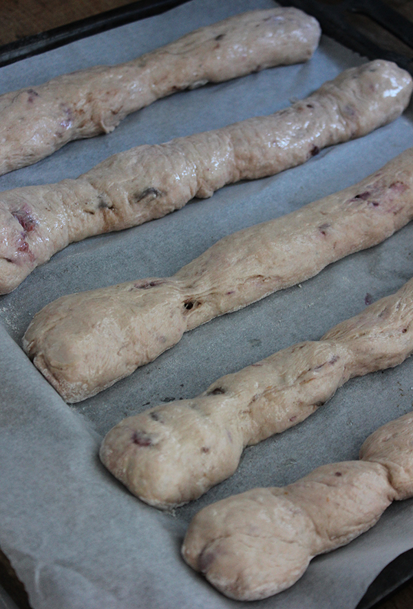 - Wyrośnięte ciasto przekładamy na oprószony mąką blat, dzielimy na 8 części, z każdej z nich formujemy podłużny długi paluch. Układamy je w odstępach na blasze wyłożonej pergaminem, przykrywamy na 30 minut.