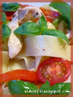 Kiedy makaron był miękki odcedziłam go, a w garnku, w którym się gotował rozgrzałam łyżkę oliwy. Zeszkliłam na niej cebulę, dodałam paprykę i kurczaka pokrojonego w paski, podgrzałam chwilę a następnie dodałam makaron. Wymieszałam wszystko dokładnie a na końcu dodałam pomidorki. Przemieszałam jeszcze całość a po nałożeniu na talerze udekorowałam listkami bazylii. Gotowe!