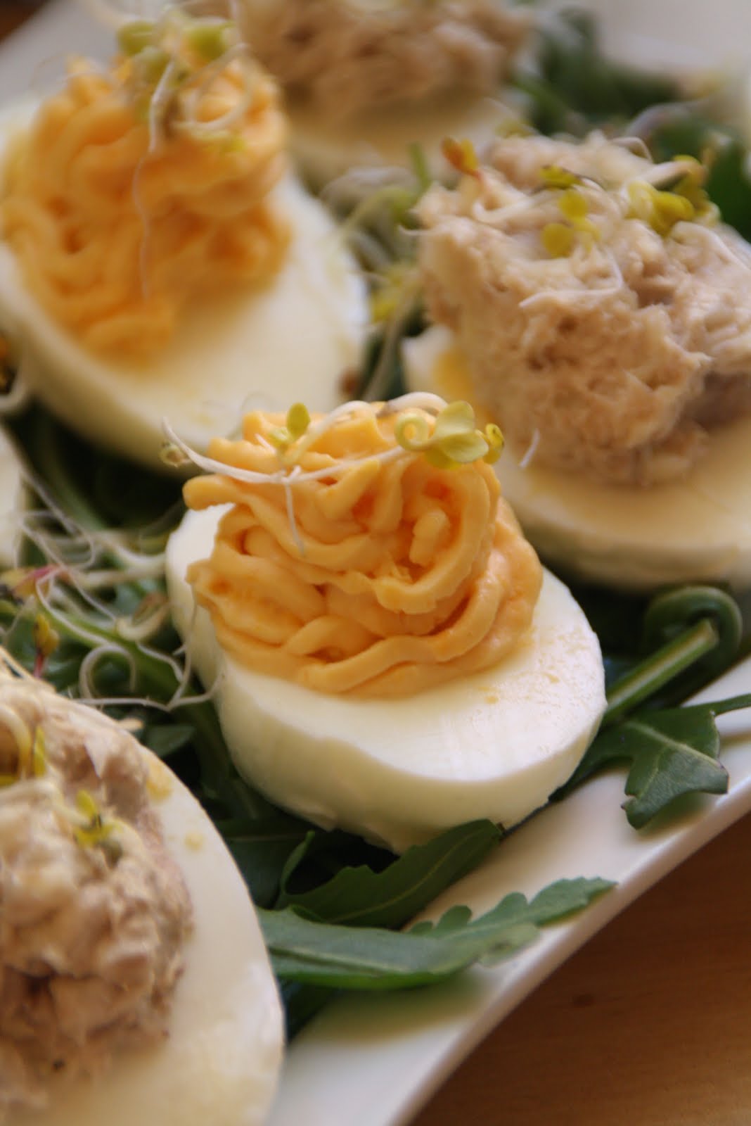 Jajka ugotować na twardo, ostudzić, przekroić wzdłuż na pół. Delikatnie wyjąć żółtka i włożyć do miseczki. Dodać musztardę majonez przyprawy i wymieszać na gładka masę. Do pustych białek nałożyłam pastę szprycą i udekorowałam kiełkami co również zaostrzyło smak. Polecam.