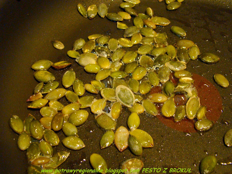 Uprażyłam pestki dyni, dodając odrobinę oliwy.Zamiast pestek dyni możecie użyć orzechy bądź pestki słonecznika.