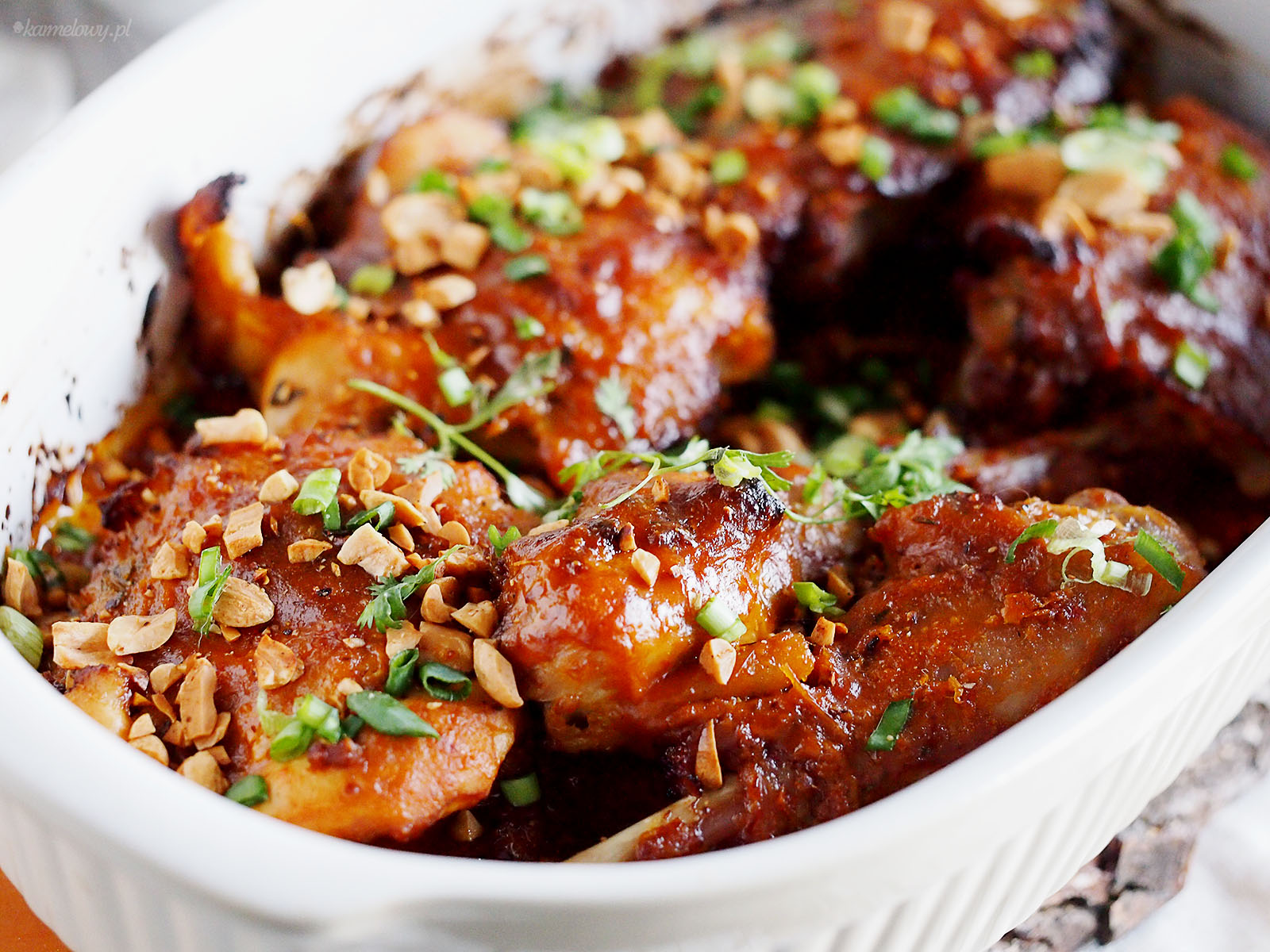 Dziś przedstawiam przepis na doskonałego pieczonego kurczaka w obłędnym sosie z masłem orzechowym, pastą curry, miodem i mlekiem kokosowym. Uwielbiam ten sos i z pewnością zagości w mojej kuchni jeszcze nie raz w zestawieniu z innymi rodzajami mięs, a może nawet z warzywami ? Polecam to danie gorąco, tym bardziej, że jest bardzo łatwe w przygotowaniu. Zapraszam!