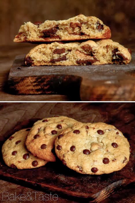 Gotowe ciasto należy schłodzić przez kilka godzin w lodówce, a najlepiej przez całą noc. Można schłodzić całą miskę z ciastem, bądź tuż po wyrobieniu, podzielić ciasto na porcje (ok. 1 pełnej łyżki na jedno ciasteczko), uformować kule, lekko spłaszczyć, ułożyć na blasze obok siebie i schłodzić tak już uformowane ciastka.
