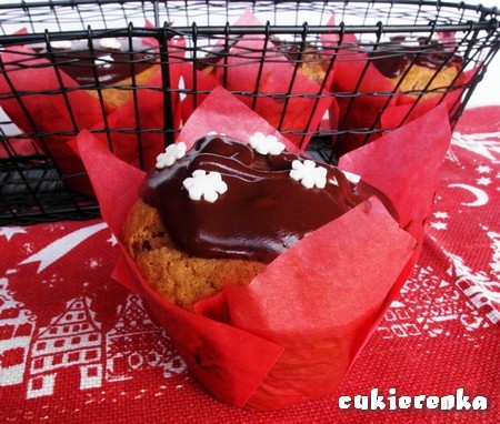 Piernikowe muffinki z moczonymi w rumie śliwkami oblane czekoladą