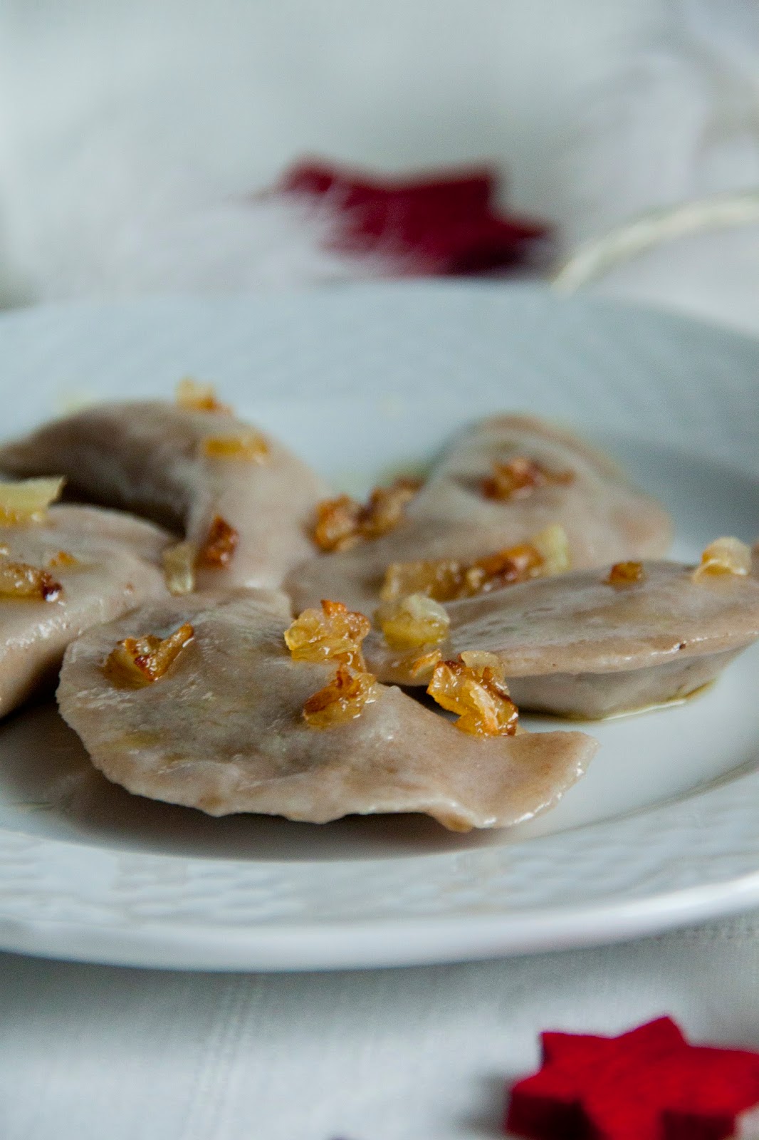 Pierogi gryczane z kapustą, grzybami i żurawiną