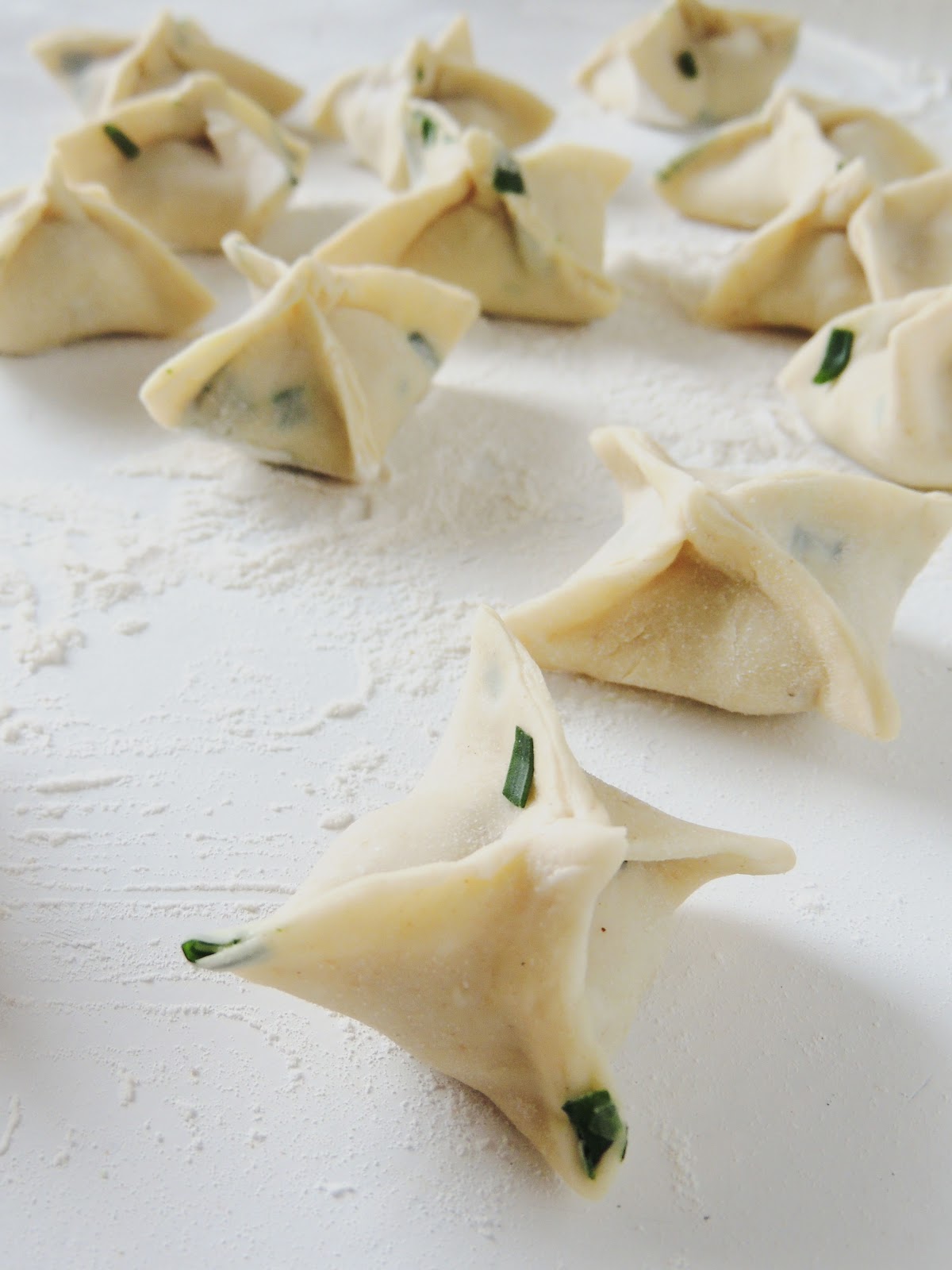 Pierożki w szczypiorkowym cieście, z soczewicą i grzybami