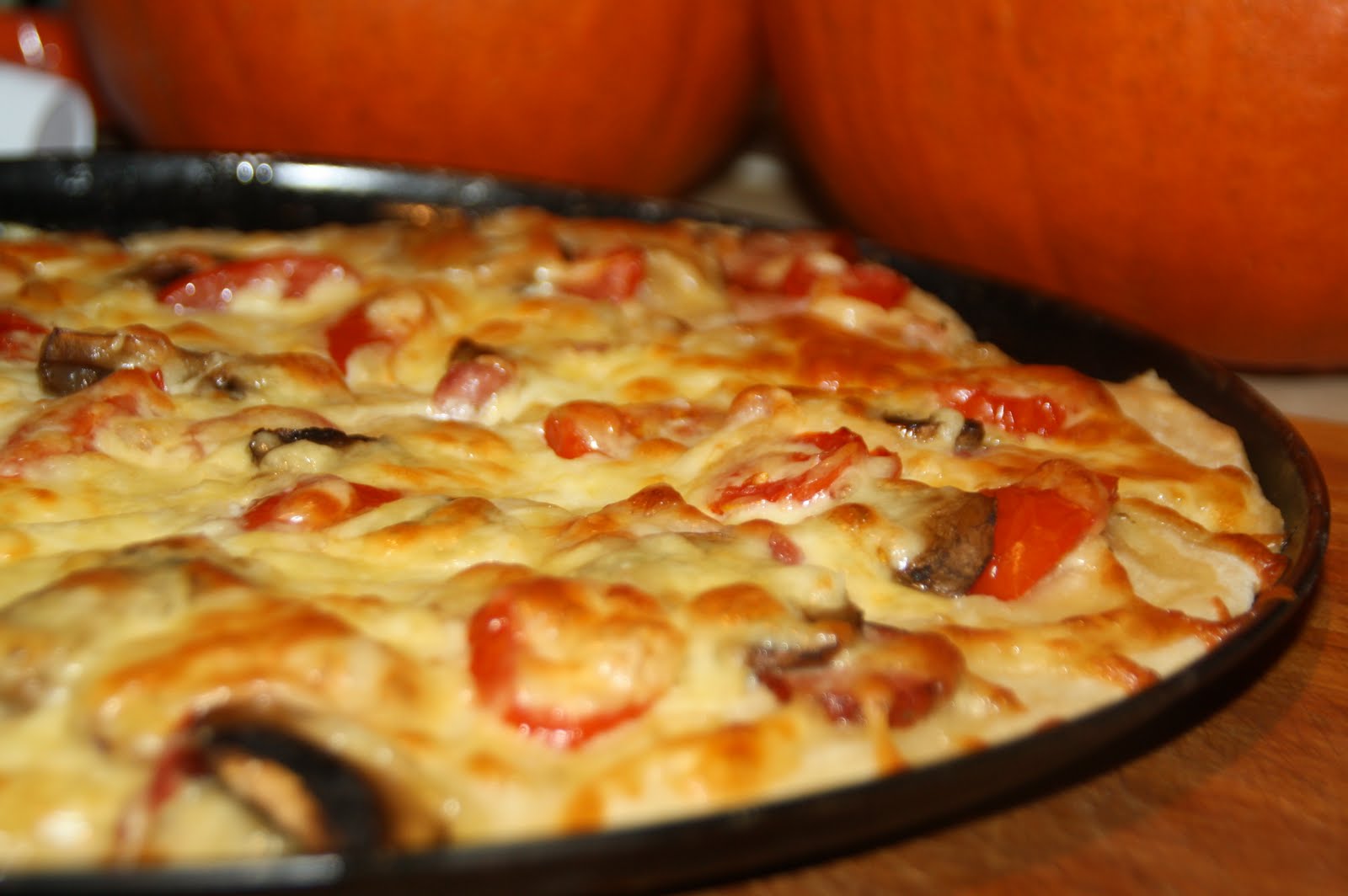 Na pizzy znalazły się: kiełbaska chłopska (ulubiona Bartusia), boczek wędzony, duszona cebula, pieczarki w plasterkach, pomidorki daktylowe, ser salami, oregano a wszystko to na sosie czosnkowym (jogurt grecki+majonez+czosnek), bez którego dla Bartka nie istnieje wiele dań :) .