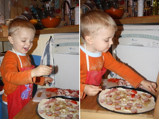 Pisałam już wcześniej, że Bartek bardzo lubi pomagać w kuchni. Muffinki i pizza to jego ulubione dania do pomagania. Wczoraj właśnie robił Bartuś pizzę przy pomocy Michała.
