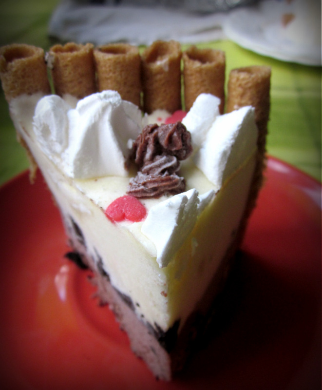 Wykonanie: -Tortownicę wyłożyć folią spożywczą lub aluminiową. -Boki obłożyć dookoła waflowymi rurkami. - Czekoladowe ciastka pokruszyć na duże kawałki. -Połowę z nich równomiernie wysypać na spód tortownicy. -Czekoladę gorzką wraz z kakao umieścić w miseczce i rozpuścić w kąpieli wodnej. -Rozpuścić również białą czekoladę.Odstawić. -Serek mascarpone starannie wymieszać z cukrem pudrem. -Schłodzoną śmietanę ubić na sztywno i połączyć z serem. -Masę podzielić na dwie części. -Do jednej dodać schłodzoną gorzką czekoladę, a do drugiej białą. -Masy delikatnie wymieszać. -Do jasnej masy dodać drobno pokrojone migdały, a do ciemnej orzechy. -Jeśli ktoś lubi bardzo słodkie desery może wrzucić do białej masy kilka pokruszonych bezików ,a do masy ciemnej pokrojony drobno baton snickers. -Ciemną masę wyłożyć na przygotowany spód. -Posypać drugą częścią pokruszonych ciastek. -Przykryć białą masą. -Wierzch wyrównać i udekorować bezikami /ewentualnie kolorową posypką i odrobiną ciemnej masy/. -Tort owinąć folią spożywczą i wstawić na kilka godzin do zamrażarki /najlepiej na noc/. -Zmrożony tort wyjąć 15-20 minut przed podaniem i umieścić w lodówce. -Podawać udekorowany świeżymi sezonowymi owocami. -Rozmrożony powinien być zjedzony w całości / nie mrozić ponownie/.