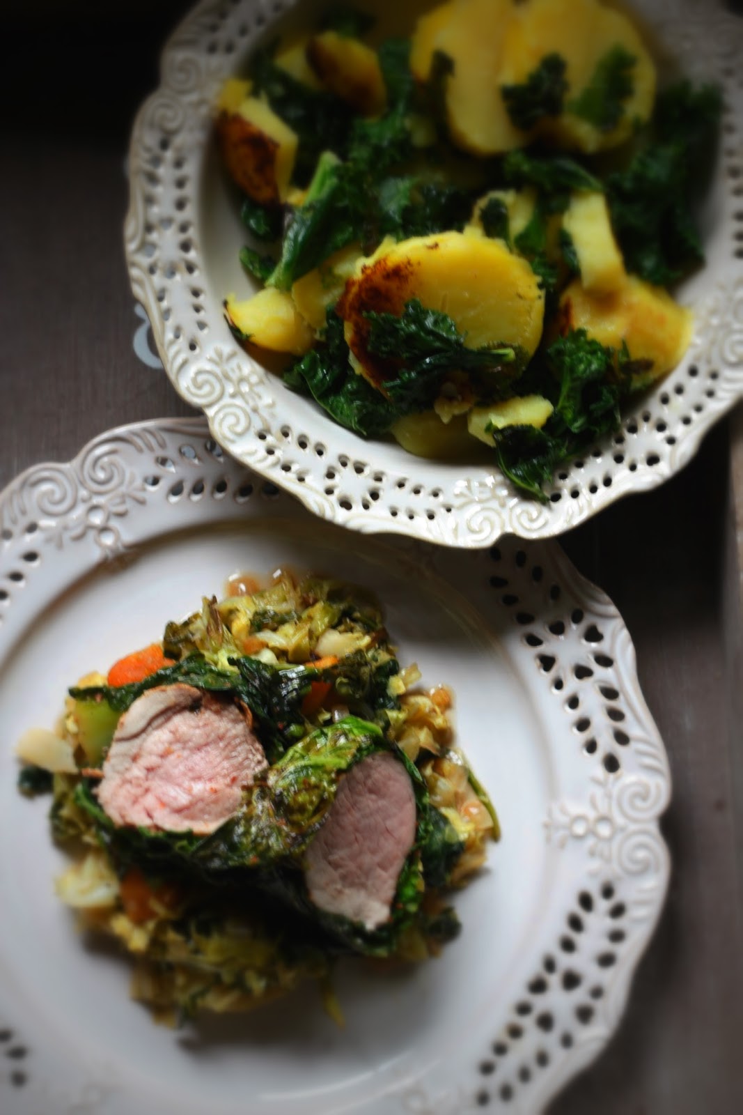 Polędwiczka na młodej kapuście z ziemniakami, jarmużem i winegretem z oleju rzepakowego
