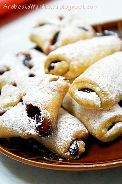 Po schłodzeniu ciasto dość cienko rozwałkować i pokroić na kwadraty. Zależnie od tego , jaki kształt ciasteczek chcemy uzyskać , nakładać marmoladę wzdłuż jednego boku i zwijać w ruloniki lub też nakładać marmoladę (albo dżem) na środek i składać w kopertę , zlepiając tylko rogi kwadratów. Piec w temp. 200 st.C na rumiano (ok. 20 minut). Po upieczeniu posypać cukrem pudrem.
