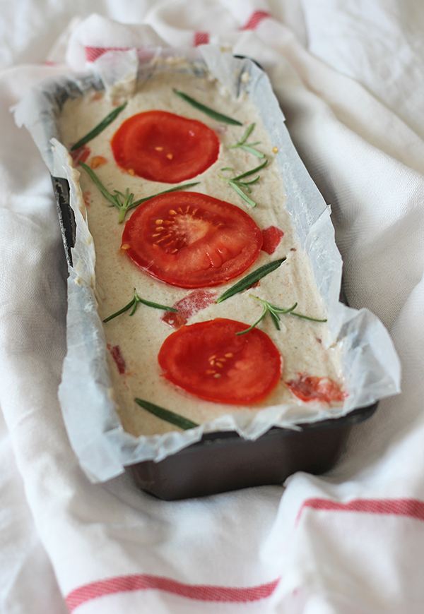 - Formę keksówkę 10x24 cm wykładamy pergaminem i skrapiamy oliwą. Przekładamy do środka, wierzch wyrównujemy i dekorujemy plastrami pozostałego pomidora oraz listkami rozmarynu. Przykrywamy na 4,5 h.