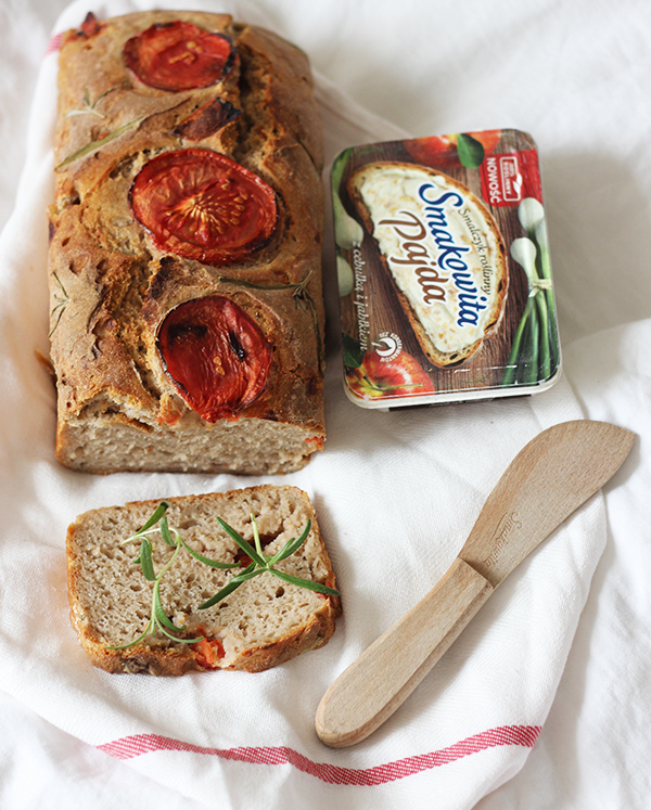 Muszę powiedzieć, że chleb wyszedł znakomicie, jeszcze lepiej niż się spodziewałam. Pomidory fantastycznie komponują się z posmakiem lekko kwaskowatego, ale przy tym delikatnego żytniego chleba.