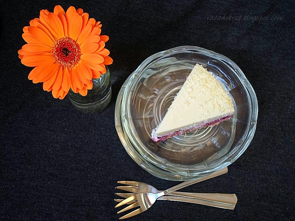 Na twarogu, więc jest polski akcent, ale konsystencję ma raczej kremową i ciężką. Słodko-kwaśny za sprawą cytryn, niezwykle świeży dzięki malinom. Ja niestety nie mogłam znaleźć świeżych, ale z mrożonymi też był pyszny. Poza Mamą C. wszyscy konsumujący zgodnie stwierdzili, że jest pycha. Mi smakował bardziej od tortu, ale ja na punkcie serników mam jednak lekkiego hopla... Tak czy inaczej - polecam serdecznie. Naprawdę warto spróbować.