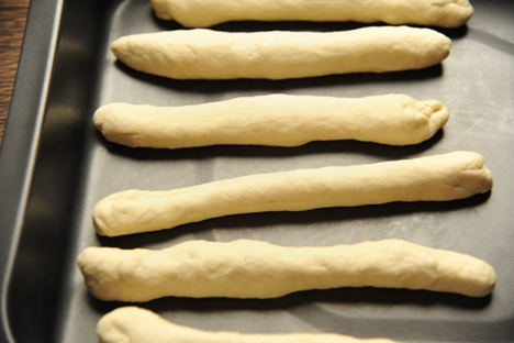 - Z każdej części uformuj długi paluch i ułóż na wyłożonej papierem do pieczenia blasze. Odstaw ponownie w ciepłe miejsce na ok. 30 minut.