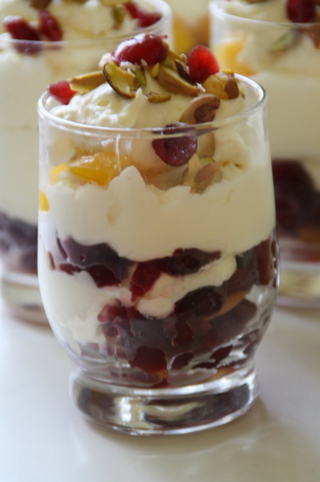 Żurawinę zagotować w wodzie. Odcedzić i wrzucić na godzinę do syropu brzoskwiniowego. Potem odsączyć ale soku nie wylewać. Mascarpone ubić z jogurtem i cukrem, dodać ubitą kremówkę. Delikatnie wymieszać. Biszkopty namoczyć w syropie brzoskwiniowym. Układać warstwami naprzemiennie: biszkopty, żurawinę, masę serową, brzoskwinie, tak aby na wierzchu została masa serowa, którą posypujemy pistacjami i ew kilkoma żurawinami. Deser przepyszny.