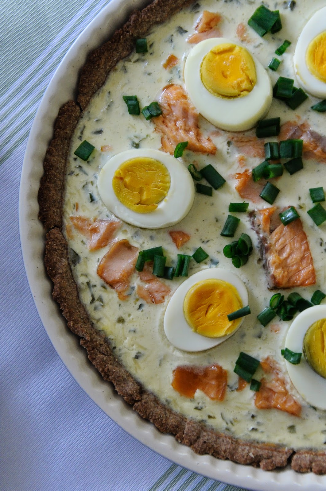 Jest to przepyszna wielkanocna tarta. Na razowym spodzie, z jajkami i łososiem, posypana szczypiorkiem. Jak dla mnie - idealna! Jest dość zapychająca i treściwa. Może być i na obiad, i na przekąskę :)