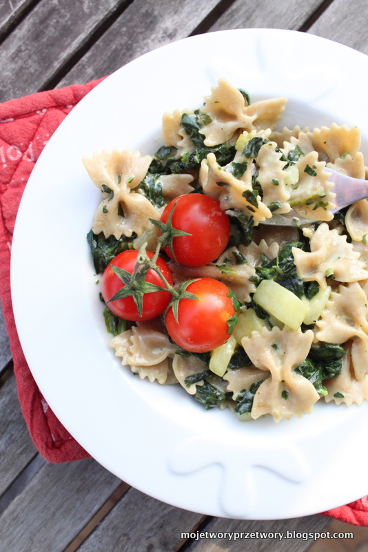 Dziś zapraszam na pełnoziarniste kokardki, otulone szpinakowym sosem i cukinią - było tak pysznie, że na kolację mój M. zażyczył sobie powtórkę i ja rozmawiając przez telefon z Przyjaciółką - spełniłam Jego prośbę i poczyniłam go ponownie.