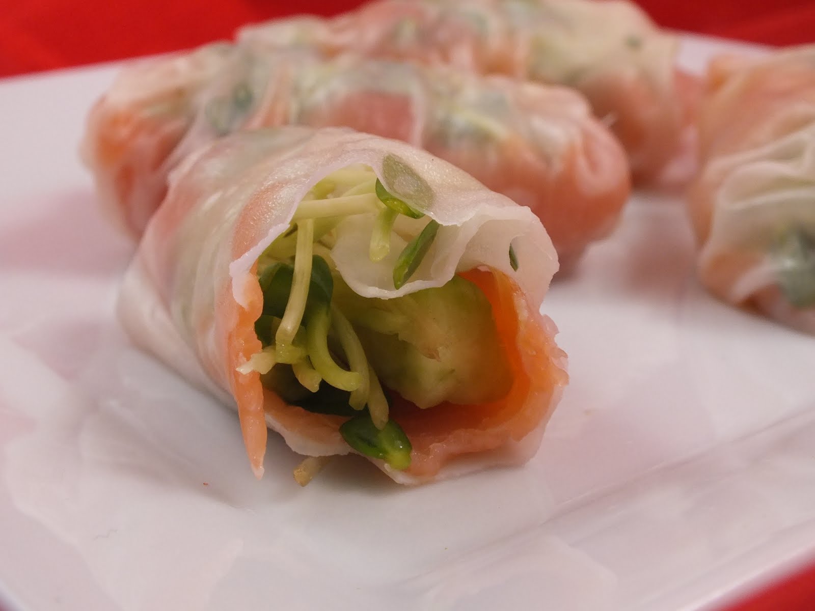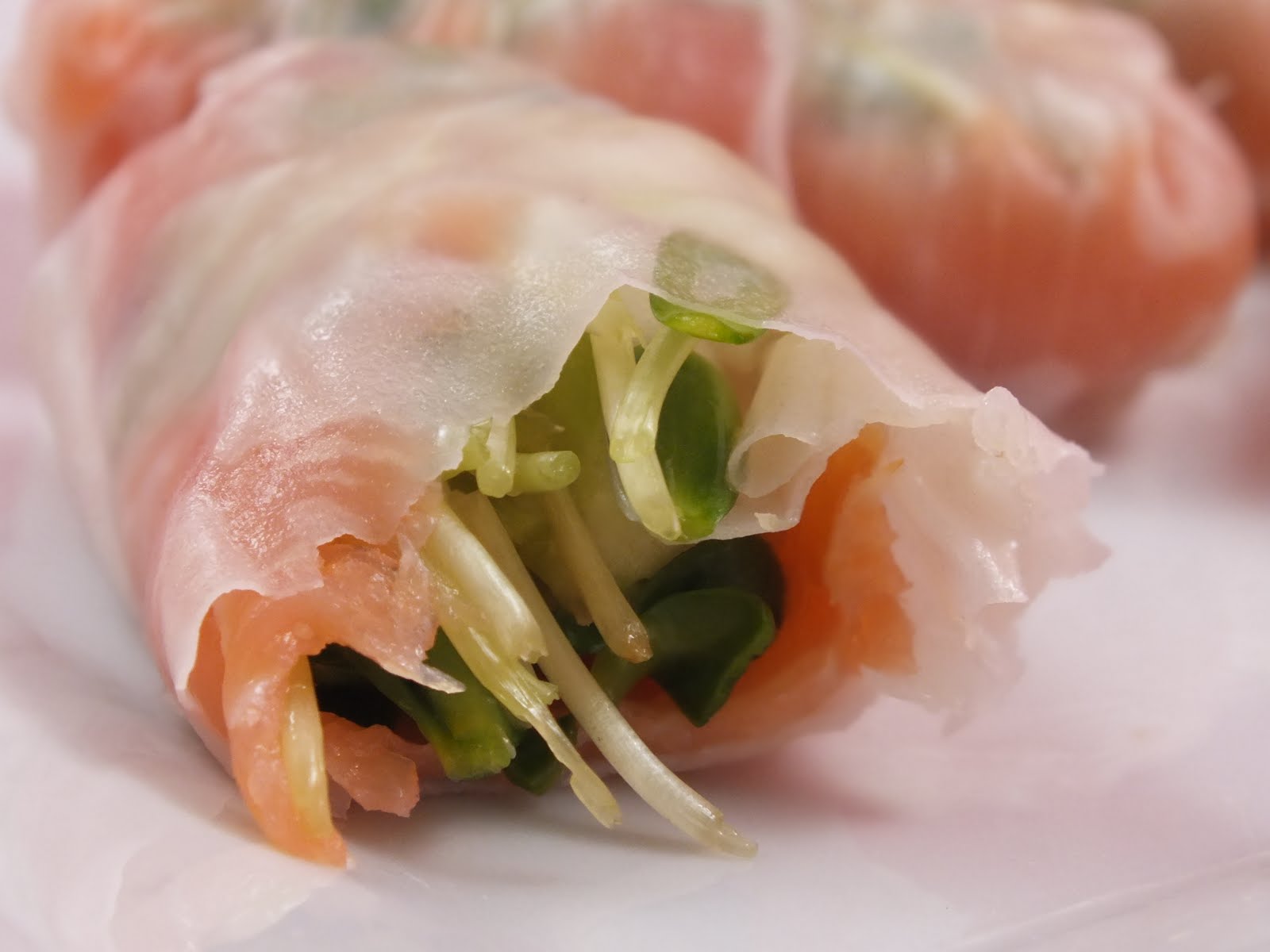 Arkusze papieru ryżowego kolejno zmoczyć wodą i układać po plasterku łososia, kawałku ogórka i kiełków słonecznika. Zwijać w roladki.