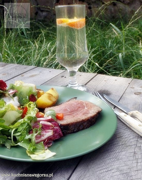 Ja podałam jeszcze miks sałat z sosem balsamicznym ( sos balsamiczny + sok z pomarańczy) oraz ziemniakami podgotowanymi i później upieczonymi ziemniakami.