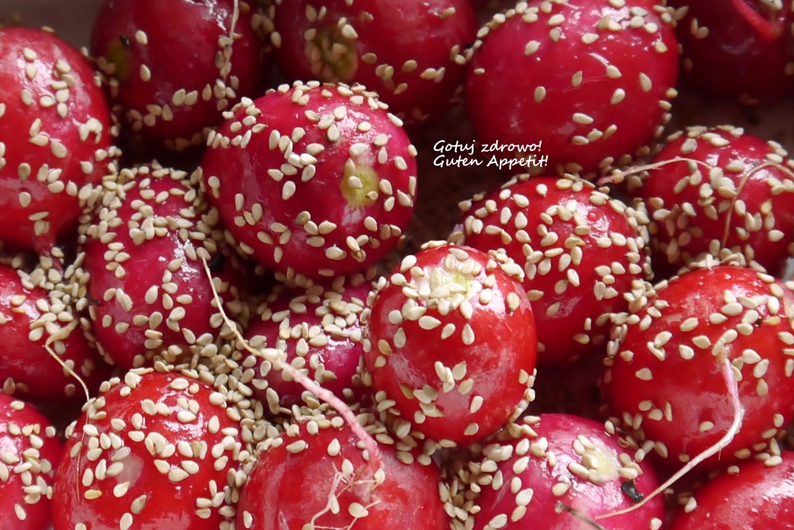 - rzodkiewki i olej umieścić w naczyniu żaroodporym i wymieszać. Posypać rzodkiewki sezamem