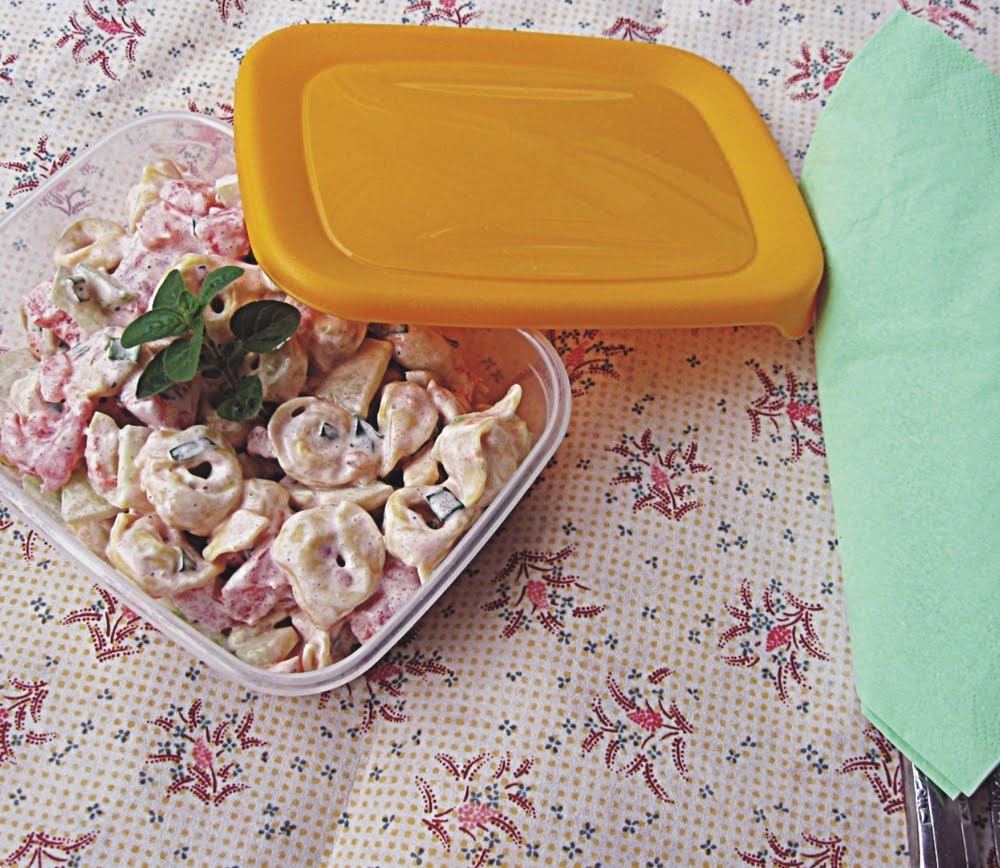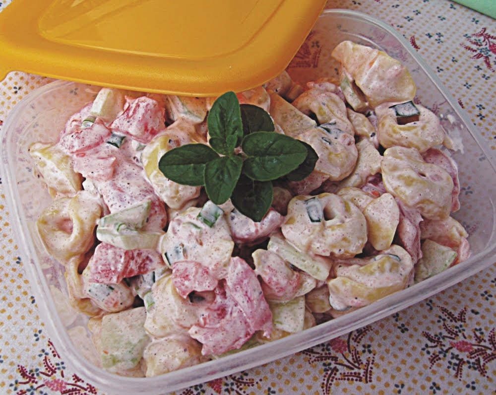 Tortellini ugotować zgodnie z przepisem na opakowaniu. Pomidory obrać ze skórki, pokroić w kostkę, ogórki również. Szczypiorek posiekać. Wszystko wymieszać z majonezem, doprawić.