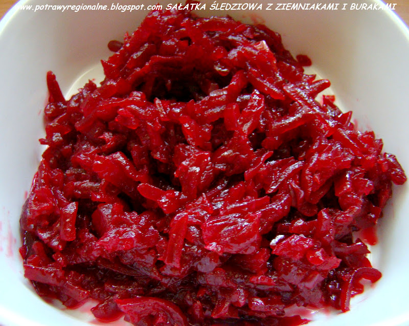 Ugotowałam buraczki w łupinkach, obrałam ze skórki i starłam na tarce o dużych oczkach.Można oczywiście jeśli wolicie pokroić je w kostkę.