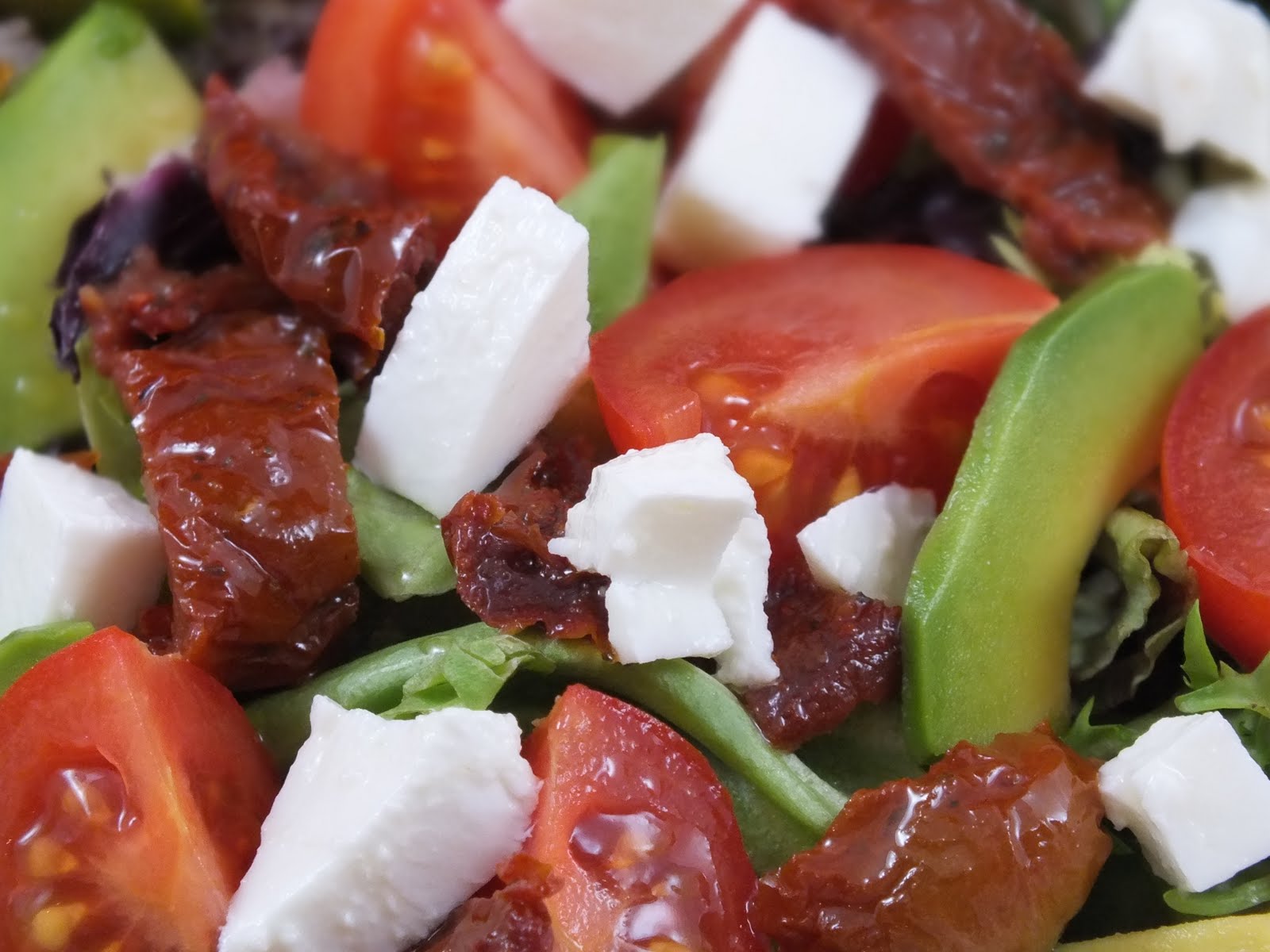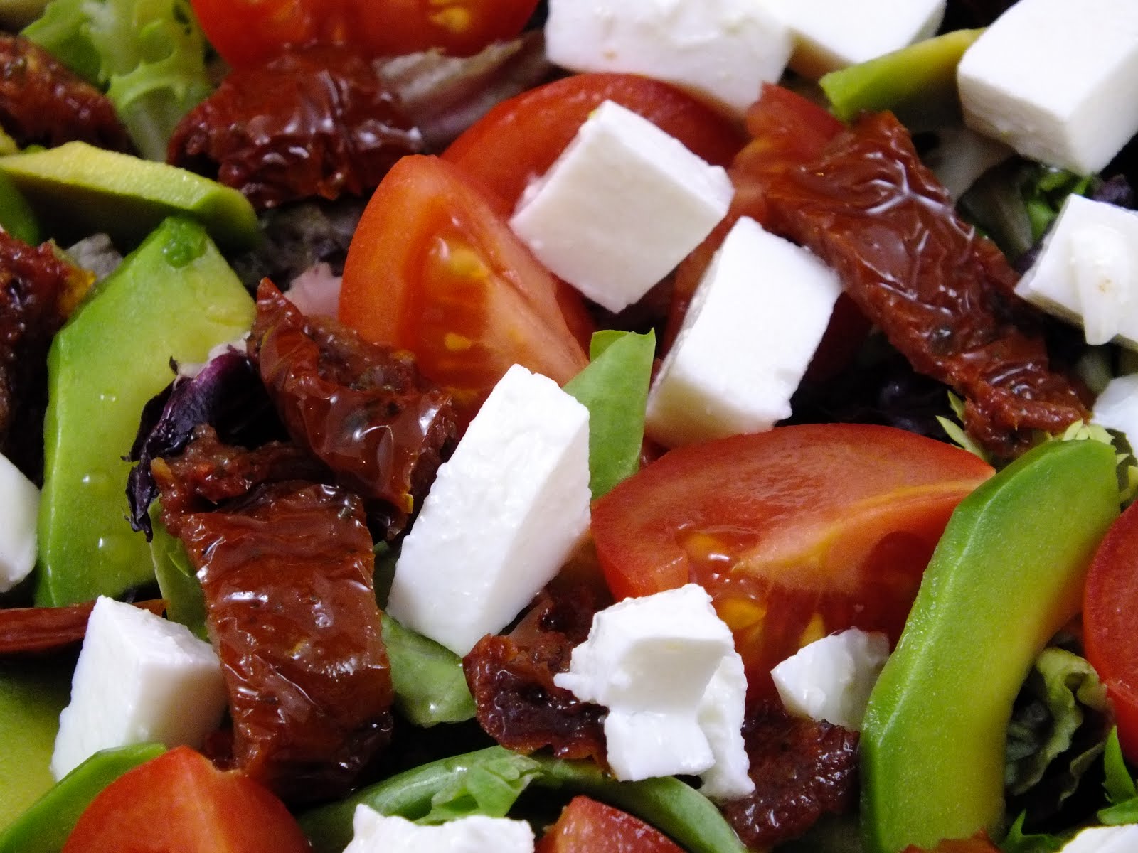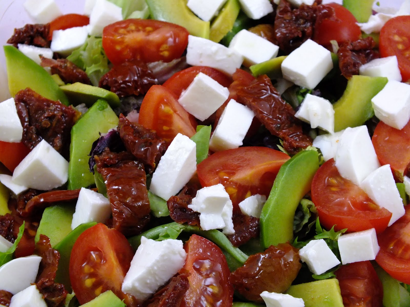 Pomidorki kroimy na ćwiartki, pomidory suszone kroimy na kawałki, awokado w kostkę. Sałatę skrapiamy sokiem z cytryny i posypujemy pestkami. Na to układamy pomidory, awokado i mozzarellę. Solimy, pieprzymy i całość polewamy łyżką oliwy (ja użyłam oliwy ze słoiczka z suszonymi pomidorkami).