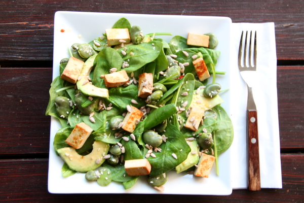 Sałatka z bobem i tofu to zdrowa, pełnowartościowa kompozycja mogąca zastąpić obiad lub być pyszną, lekką kolacją. Zawiera: wszystkie niezbędne aminokwasy, wapń, potas, magnez, fosfor, żelazo, cynk, miedź wit. A,E, B1,B2, B6,C, niacynę i foliany. Do tego połączenie bobu, tofu, awokado naprawdę się świetnie komponuje. Sałatka idealna na każdą okazje i każdą porę dnia. Jeśli nie lubicie tofu możecie zastąpić go ricottą (słona wersją), serem feta czy serkiem kozim.