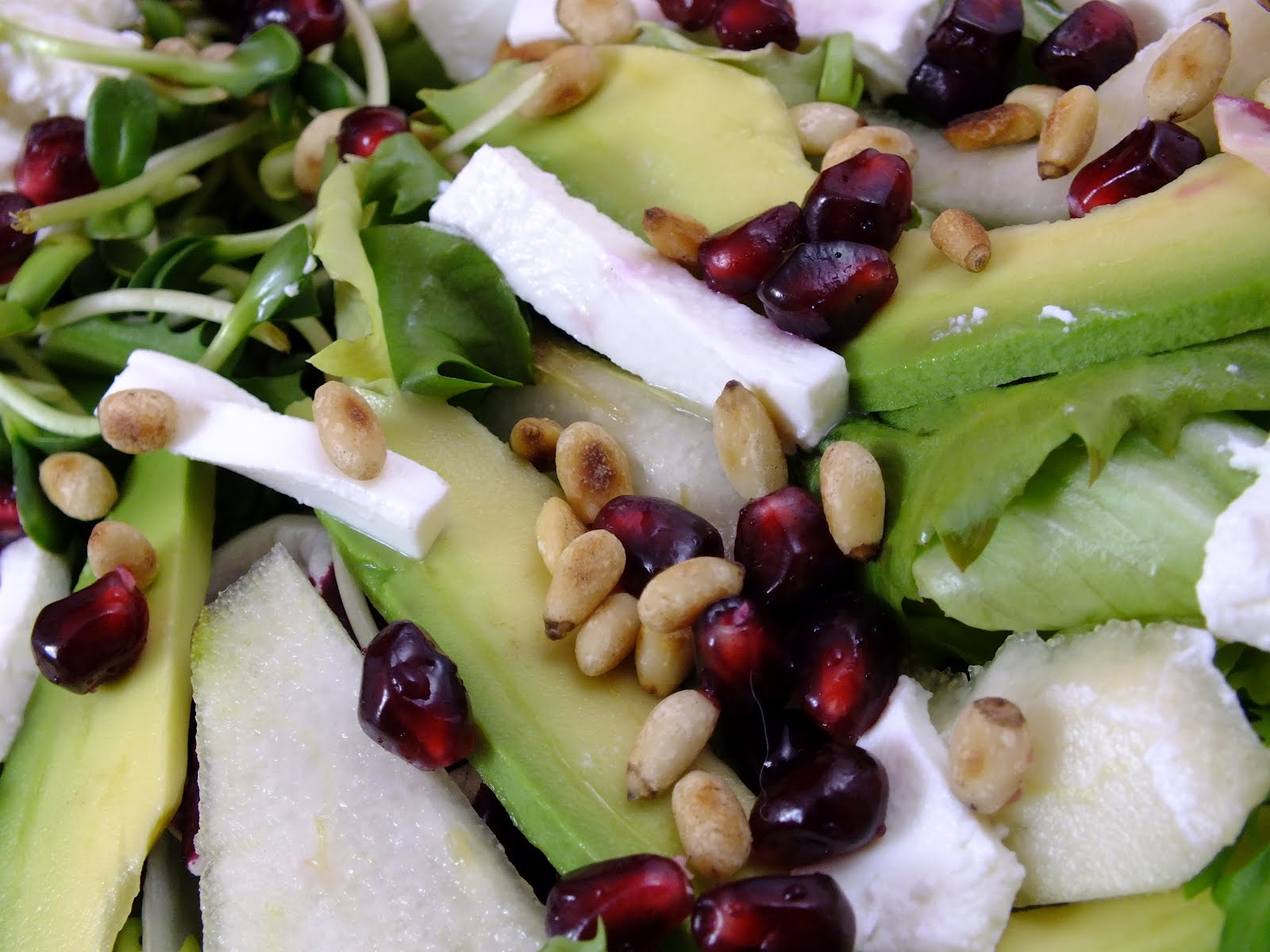 Sałaty rozłożyć na półmisku. Awokado, gruszkę obrać i pokroić w cienkie półplastry. Kiełki słonecznika, awokado, gruszkę oraz kawałki ricotty ułożyć na talerzu wg własnej kreatywności Całość posypać wydrążonymi pestkami z granatu. Orzeszki pinii uprażyć na suchej patelni i posypać sałatkę.Dressing: w szklaneczce wymieszać dokładnie miód z octem jabłkowym, dodać oliwę i mieszać do połączenia składników. Sałatke polać przygotowanym dressingiem i podawać