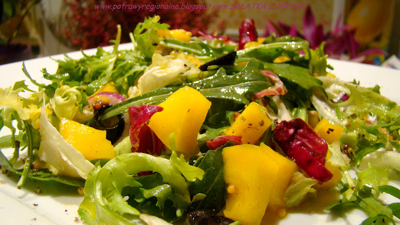 Mango jest jednym z najwykwintniejszych owoców tropikalnych na świecie ze względu na przyjemny smak, zapach i kolor.Miąższ mango jest żółty,kremowy, gęsty, delikatny i orzeźwiający, z subtelnym i upajającym zapachem.Owoce są słodkie, aromatyczne oraz bogate w witaminy i minerały.Polecam sałatkę z tym żółtym i egzotycznym owocem.Umyłam i wymieszałam parę rodzajów sałat, w tym rukolę.