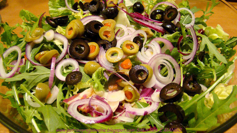Dodałam pokrojoną w plasterki czerwoną cebulę oraz czarne i zielone oliwki.