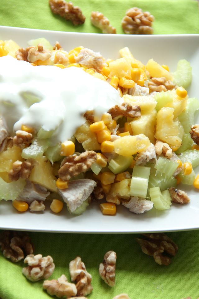 Bardzo zdrowa, pełnowartościowa sałatka z białego mięsa (u mnie indyk) z selerem naciowym, świeżym ananasem, kukurydzą i orzechami włoskimi. Bez majonezu, a z pysznym jogurtem naturalnym. Bogata w pełnowartościowe białko, witaminy i składniki mineralne. Idealna na każda okazję.