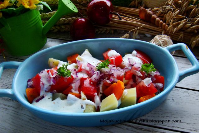 Ziemniaki i marchewkę obieramy i gotujemy do miękkości w wodzie z dodatkiem soli . PO ugotowaniu studzimy i kroimy w dość dużą kostkę . Pomidora myjemy i kroimy w kostkę . Składniki lekko mieszamy dajemy na półmisek . Cebulę czerwona siekamy dodajemy do sałatki . Robimy sos czosnkowy . Majonez mieszamy z jogurtem i śmietana solimy solą czosnkową dodajemy wyciśnięty czosnek mieszamy i chłodzimy . Zimnym sosem polewamy sałatkę