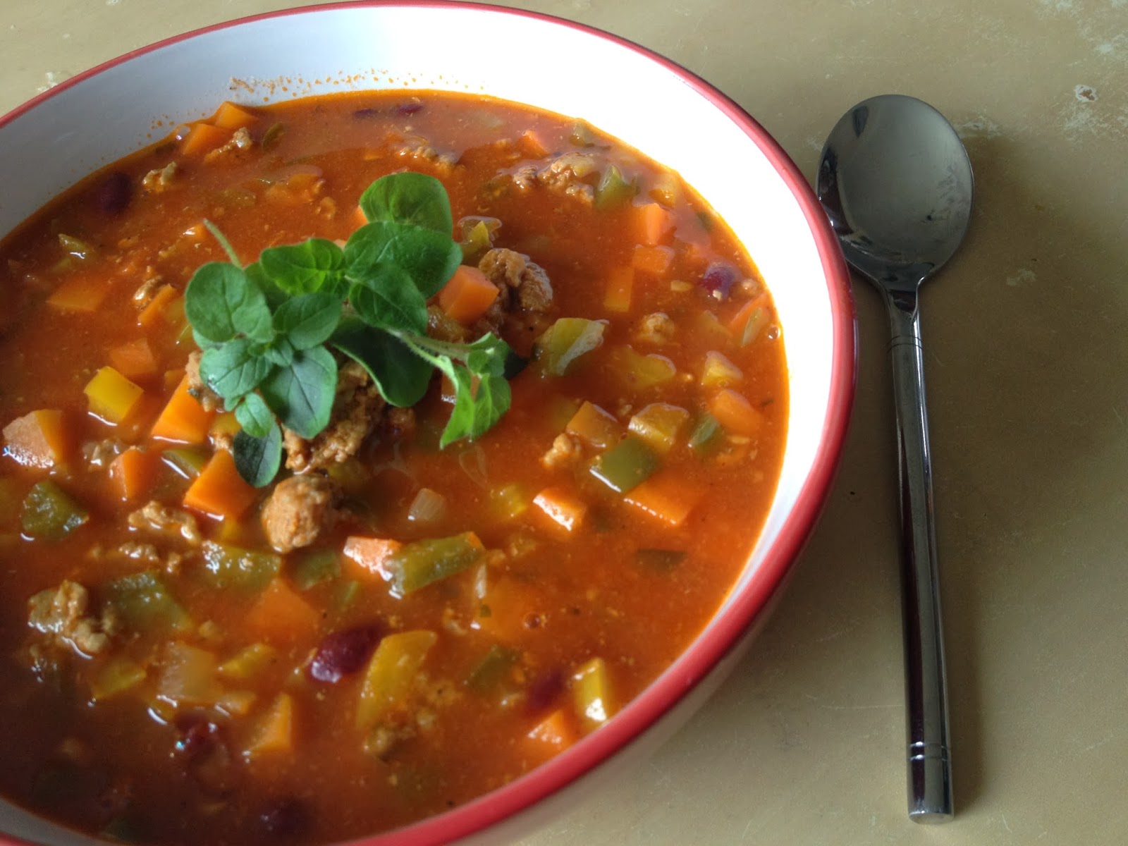Na patelni z rozgrzaną oliwą podsmażyć pokrojoną cebulę oraz czosnek, dodać mięso mielone oraz pokrojoną w kostkę marchewkę. Smażyć ok 8 min, od czasu do czasu mieszając. Dodać pokrojoną w kostkę paprykę (czerwoną i zieloną), fasolę czerwoną i smażyć kolejne 5 min. Całość przełożyć do garnka, zalać niewielką ilością wody (tak aby zupa została nadal gęsta, coś jak gulasz nawet), dodać koncentrat pomidorowy i gotować na małym ogniu przez 15-20 min. Przyprawić ziołami, solą, chilli, papryką w proszku i podawać.