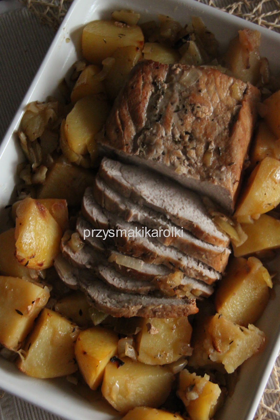 wykonanie: Ziemniaki obieramy i kroimy na ćwiartki. Cebulę kroimy w piórka lub dużą kostkę. Schab obsmażamy na rozgrzanym oleju ze wszystkich stron. Ściągamy z patelni, doprawiamy solą, pieprzem oraz ziołami. Przekładamy mięso do naczynia żaroodpornego i okładamy kawałkami masła. Pieczemy przez 20 minut w piekarniku rozgrzanym do 180°C. Po tym czasie do mięsa dodajemy cebulę i ziemniaki, które lekko solimy. Pieczemy całość kolejne 15 minut i wlewamy cydr. Od tego czasu mięso z ziemniakami pieczemy około 1 godzinę często podlewając sosem z pieczenia. Podajemy gorące. Smacznego.