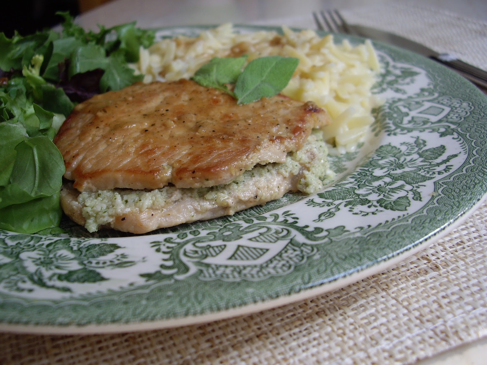 W książce Gina D'Acampo "Dieta italiana", o której kiedyś pisałam, znajduje się wiele interesujących przepisów. Jednym z nich jest ten na te przepyszne "kanapki" schabowe z pesto z szałwii. Pomysł wydawał mi się naprawdę ciekawy i nie zawiodłam się. Danie jest bardzo smaczne, oryginalne i aromatyczne. Mięso wyszło wyjątkowo kruche i wilgotne, a białe wino dodało mu wyrazu.