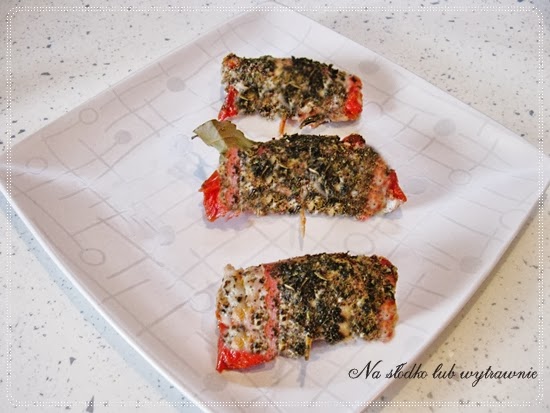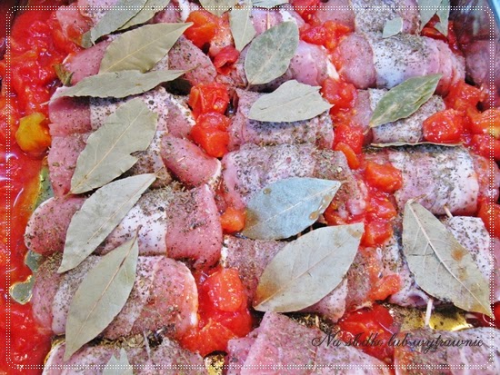 Gotowe roladki układać w dużym naczyniu obok siebie. U mnie było dosyć szerokie naczynie podobne do blachy tylko, że grubsze i wyższe. Gdy ułożymy już wszystkie roladki, całość posypać suszonym majerankiem i obłożyć listkami laurowymi.