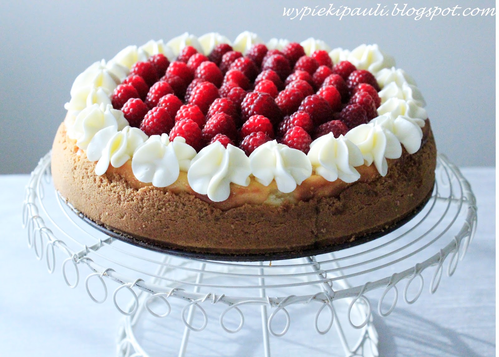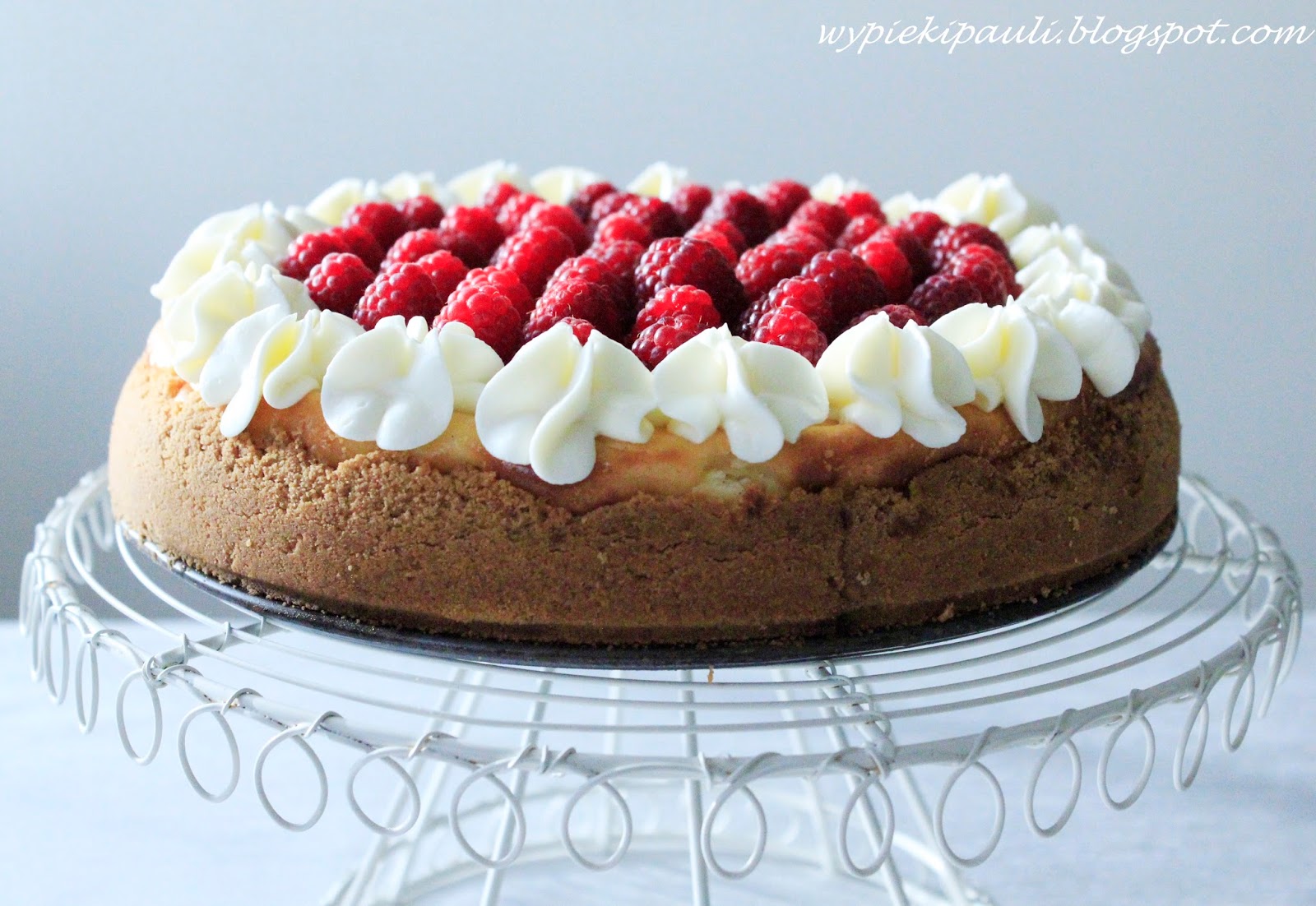 Dżem rozsmarować na wystudzonym serniku zostawiając ok. 1,5cm odstęp od zewnętrznej krawędzi sernika. Maliny ułożyć na obszarze sernika pokrytego dżemem. Śmietanę ubić z cukrem pudrem na sztywno. Śmietanę przełożyć do rękawa cukierniczego z tylką lub szprycy. Ja użyłam tylki firmy Wilton "1M". Śmietaną udekorować tort (ja wycisnełam "gwiazdki" ze śmietany). Przed podaniem schłodzić.