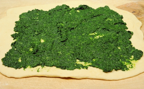 - Na prostokącie rozsmaruj szpinak, zostawiając ok. 2 cm ciasta z każdego boku.