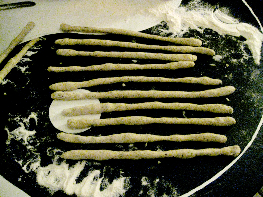 Składniki: (na około 30/40 długich paluszków) Pół kg mąki (pszenna, jak do słodkich wypieków albo graham) szklanka mleka jedno jajo mieszanka ziołowych przypraw (bazylia, oregano, majeranek, pieprz i sól) świeże drożdże (3/4 opakowania) olej lub oliwa z oliwek