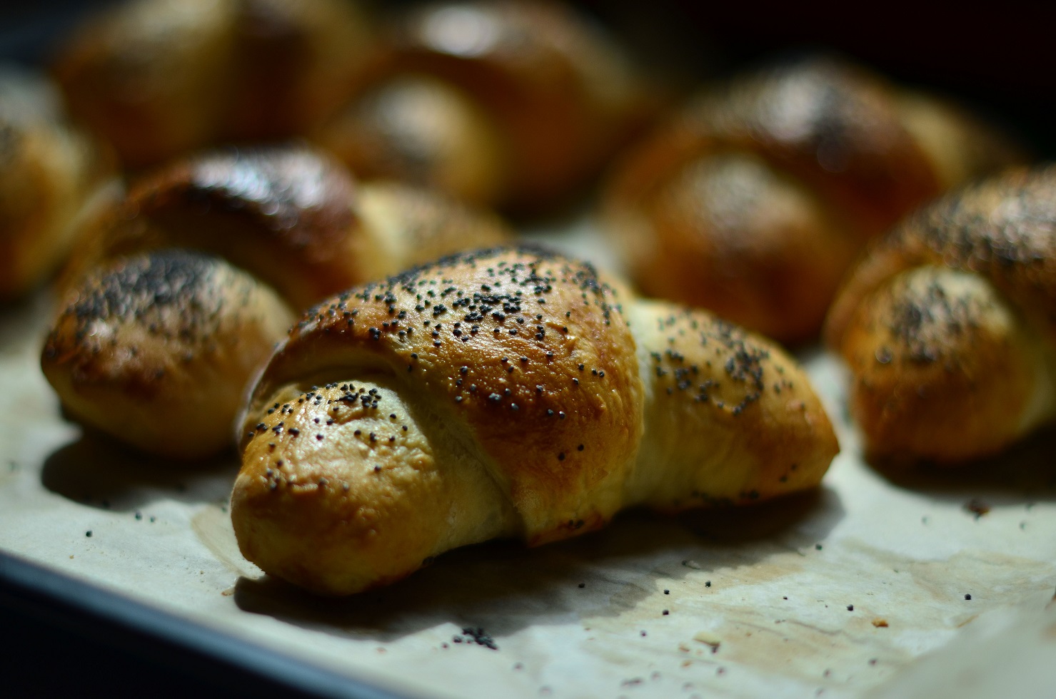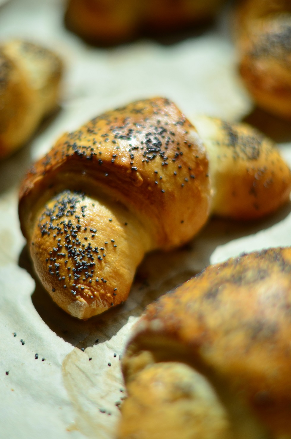 Wyrośnięte rogaliki smarujemy jajkiem wymieszanym z mlekiem oraz następnie posypujemy makiem.