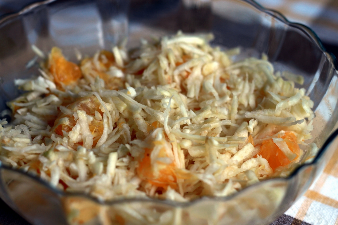 Przygotowanie: Seler potrzeć na tarce o dużych oczkach, wymieszać z sokiem wyciśniętym z cytryny. Pomarańczę pokroić w kostkę i wymieszać razem z cukrem i pozostałymi składnikami. Dobrze jest odstawić na kilka minut do lodówki.