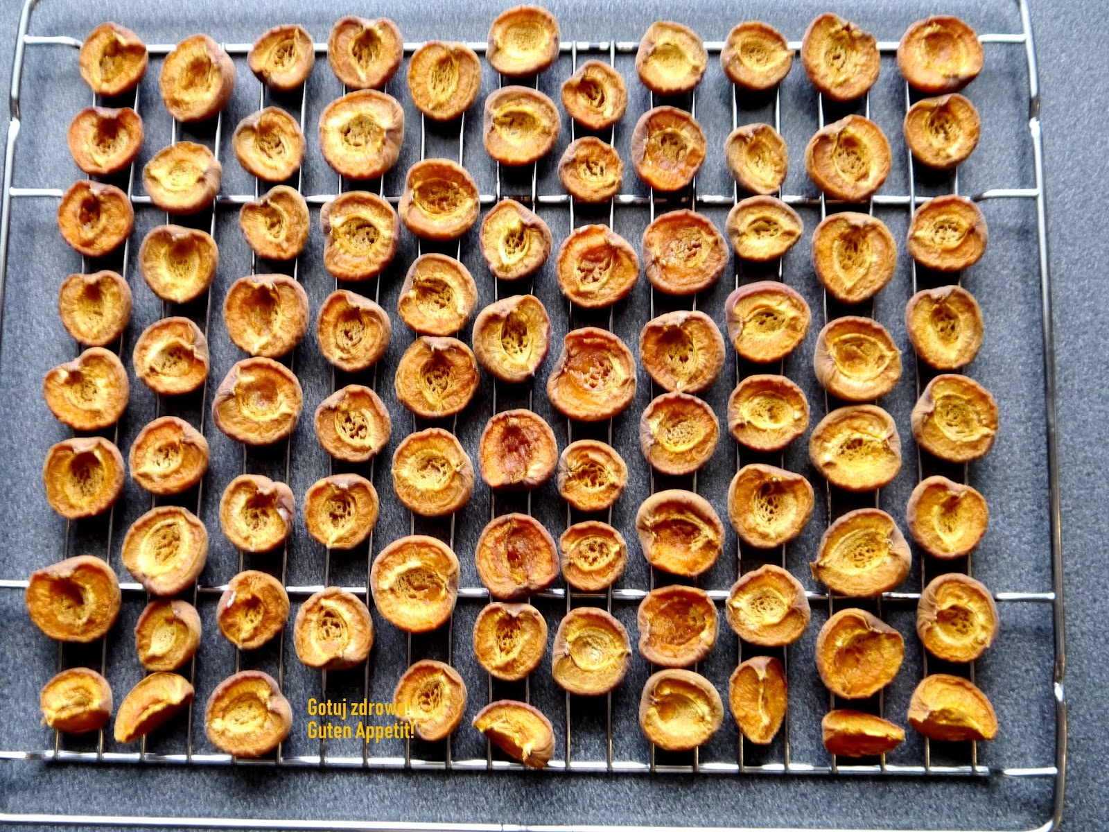 - włączyć piekarnik, ustawić na 60`C i wstawić ruszt z morelami. Piekarnika nie domykać całkowicie, zostawić ujście dla wychodzącej pary. Po jakimś czasie można temperaturę do 70-80`C
