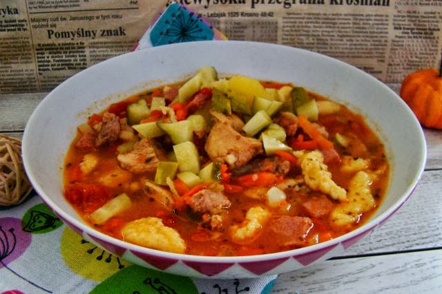 Cebulę siekamy , czosnek wyciskamy i podsmażamy na łyżce masła. Dodajemy pokrojone pieczarki i pokrojoną w kosteczkę paprykę czerwoną. Doprawiamy solą ,pieprzem do smaku. Na drugiej patelni podsmażamy na oleju pokrojone w kosteczkę mięso. Doprawiamy papryką słodka ostra i solą do smaku. Do podsmażonego mięsa dodajemy włoszczyzna z mrożonki.Podsmażamy. W dużym garnku łączymy zawartość dwóch patelni. Wlewamy Przecier pomidorowy z kartonu i wszystko razem dusimy. Dodajemy 2 - 3 szklanki wody . Doprawiamy do smaku solą , majerankiem , pieprzem i paprykami. Dodajemy obrane pokrojone w duże kawałki ziemniaki i gotujemy. Robimy z masła i maki zasmażkę dodajemy do zupy. Z mąki jajka wody i odrobimy soli robimy ciasto na kluski lane. Robimy w zupie kluseczki. Zagotowujemy. Przed podaniem posypujemy posiekanym korniszonem.