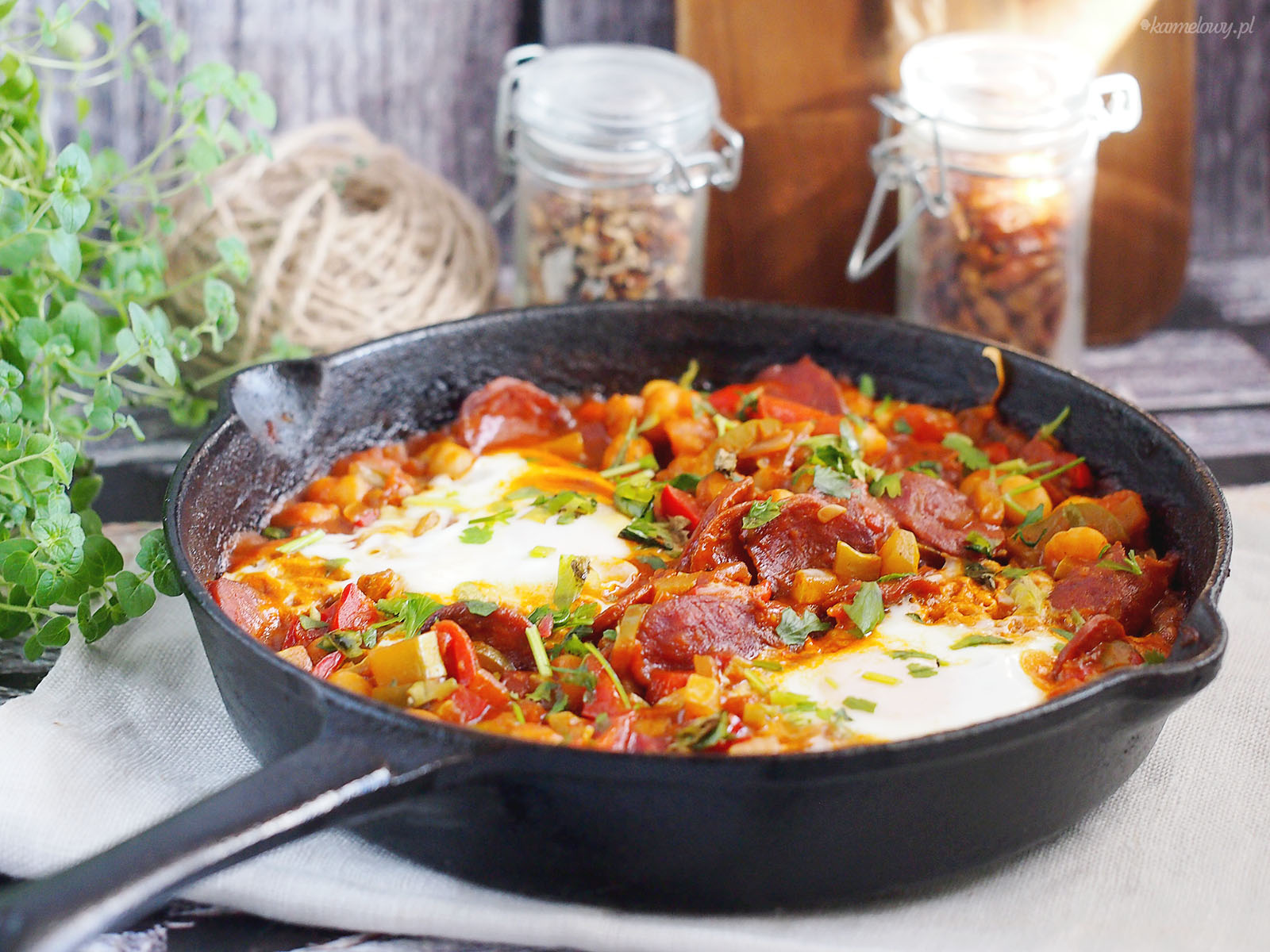 Szakszuka w wolnym tłumaczeniu oznacza wielki bałagan i ta nazwa bardzo dobrze oddaje charakter tego dania ? Generalnie jest to pozycja śniadaniowa, do której dodaję to co zazwyczaj mam w kuchni. Tym razem przygotowałam ją z chorizo, które swobodnie można zastąpić naszą swojską kiełbaską, papryką, cukinią, ciecierzycą, no i gwiazdą tej potrawy – jajkami. Najpierw podsmażamy warzywa, następnie dodajemy pomidory i na koniec wbijamy jajka, nic prostszego a śniadanie iście królewskie. Uwielbiam zajadać je z chrupiącym chlebkiem, polecam gorąco bo syci na długie godziny!