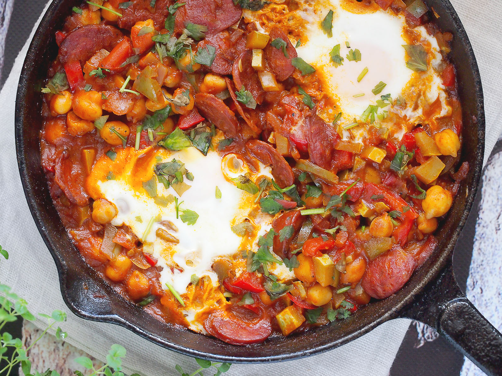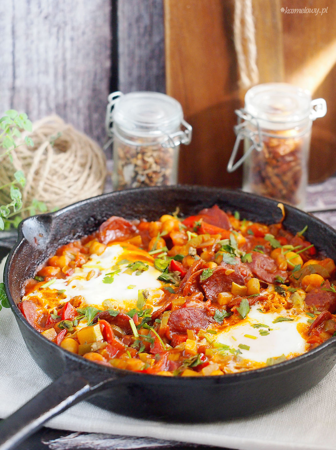 Szakszuka z chorizo, cukinią i ciecierzycą