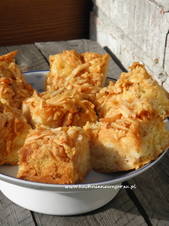 Wylewamy ciasto, na górze delikatnie wykładamy starte jabłka, posypujemy cukrem.