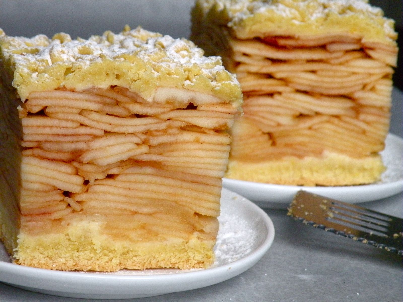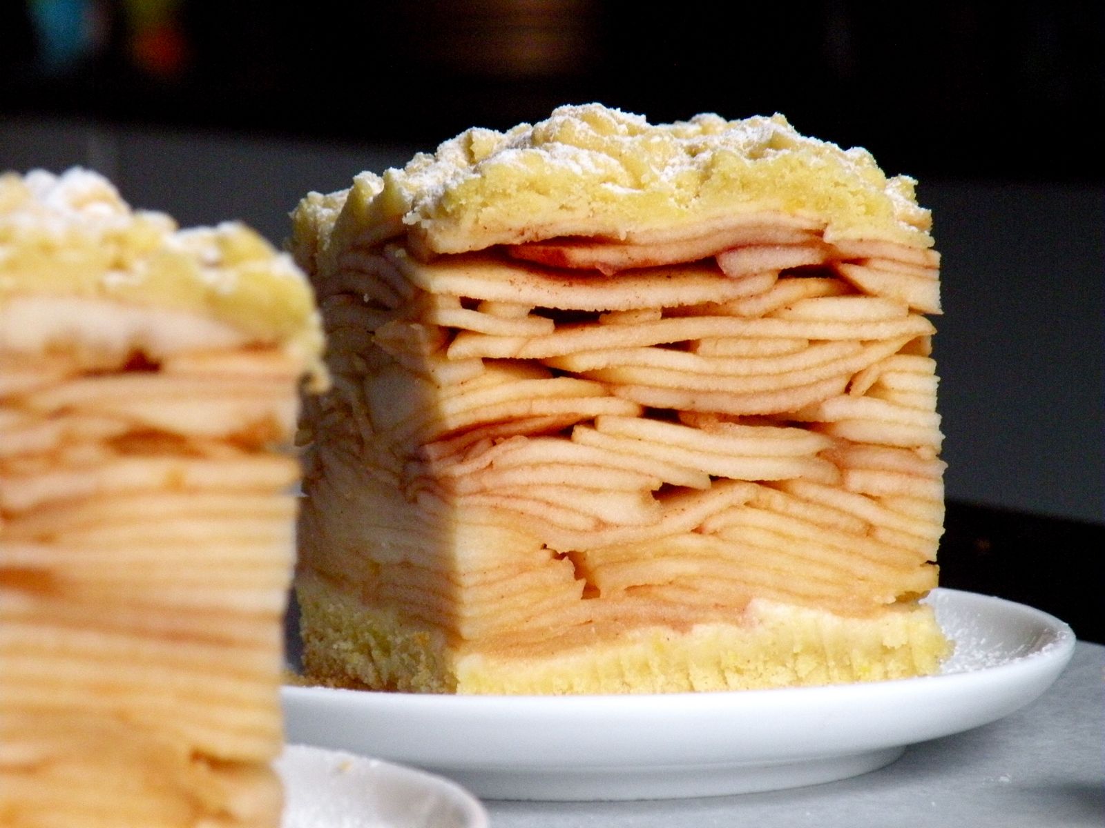 Ciasto występuje tu na zasadzie dodatku do jabłek.Z wierzchu niesamowicie kruche.Efektowna. Bardzo smaczna, ale... "